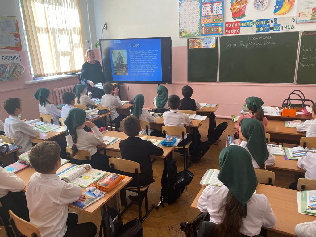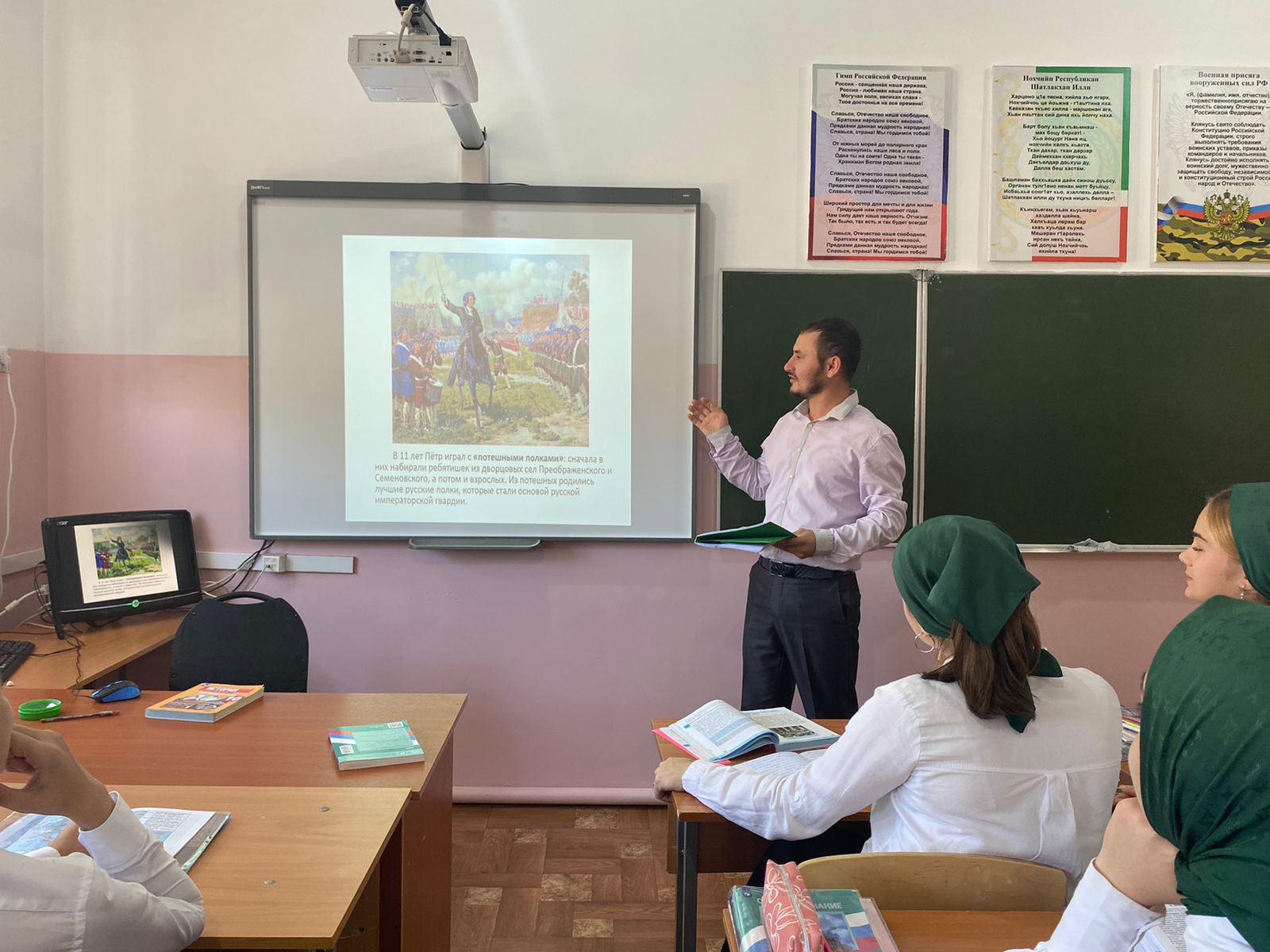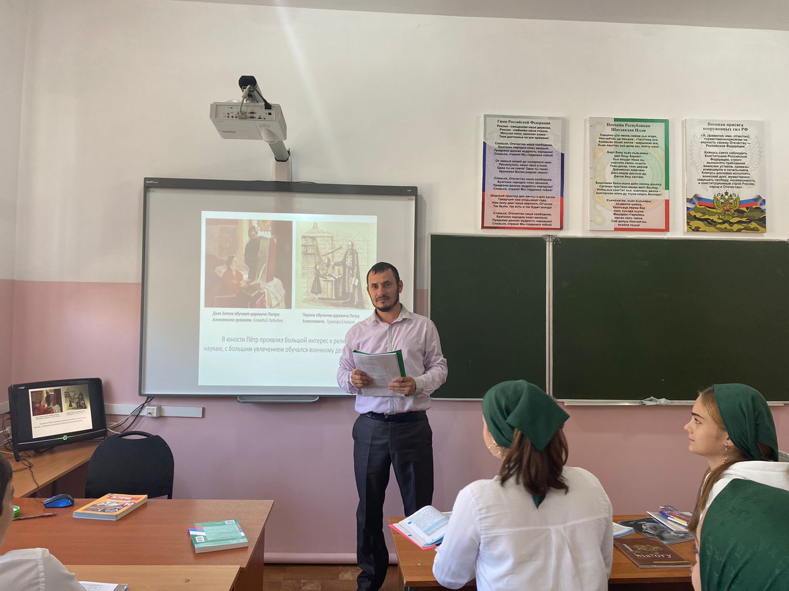 30.09.202230.09.2022г в МБОУ «СОШ им. профессора Ш. Джамбекова с. Лаха-Варанды» был проведён Всероссийский Петровский урок, посвященный празднованию 350-летия со дня рождения Петра I. Уроки были проведены учителями Исмаиловым Р.У., Исламгириевым С.С. и Исраиловой З.Л. и педагогом - библиотекарем среди обучающихся 3, 9, 10 кл.