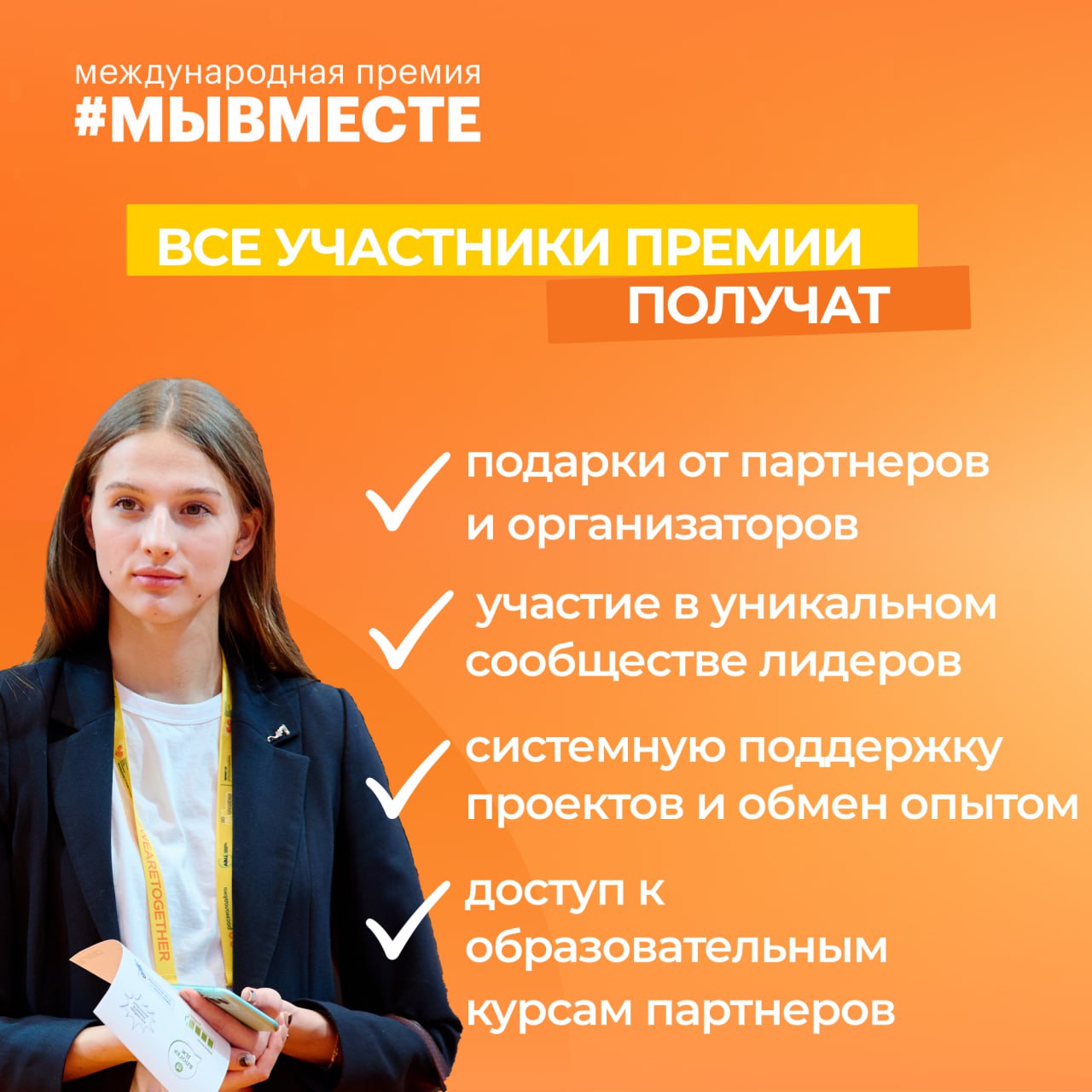 Международная Премия #МЫВМЕСТЕ посвящена гражданскому вкладу в достижение национальных целей развития России до 2030 года. Президент России поддержал инициативу учреждения Премии #МЫВМЕСТЕ, призванной выявлять лидеров социальных изменений из числа НКО, волонтеров, бизнеса и сообщества журналистов, объединения их в сильные команды клубов #МЫВМЕСТЕ во всех регионах страны. Основной целью Премии является признание и поддержка общественно значимых инициатив, направленных на помощь людям и улучшение качества жизни в России и мире. Премия стала продолжением одноименной акции и наследием Всероссийского конкурса «Доброволец России». Уже 7 лет награды лучшим проектам вручает лично Президент России Владимир Путин. Такой статус Премии подтверждает высокую оценку активной общественной, благотворительной и волонтерской деятельности в России и заинтересованность государства в развитии института и инфраструктуры лидерства в некоммерческом секторе и в бизнесе, реализующем на практике принципы корпоративной ответственности и устойчивого развития.