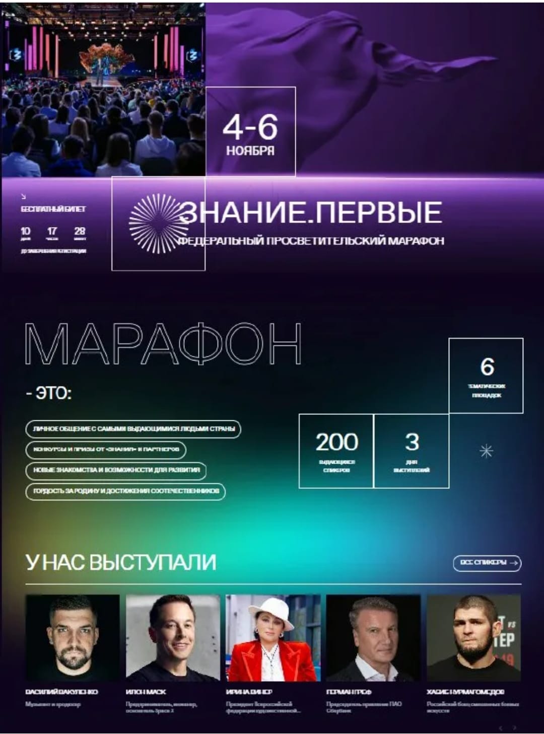 В рамках плана совместных проектов Минпросвещения России и Российского общества «Знание» в 2023 году в период с 4 по 6 ноября 2023 г. пройдет Федеральный просветительский марафон Знание.